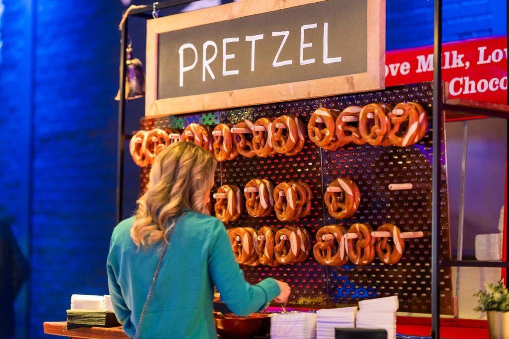 Een muur vol zachte, warme pretzels: klassiek, zoet of gekruid—handzaam, uitnodigend en ideaal voor informeel samenzijn.