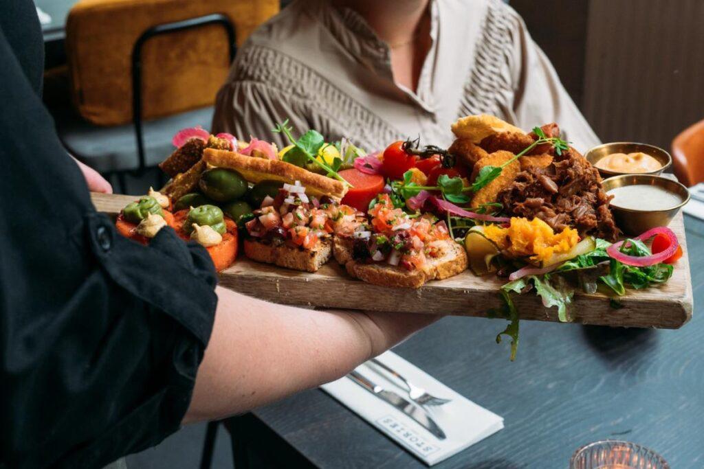 In grote schalen of op houten planken, sfeervol en stijlvol op de tafels gepresenteerd.
