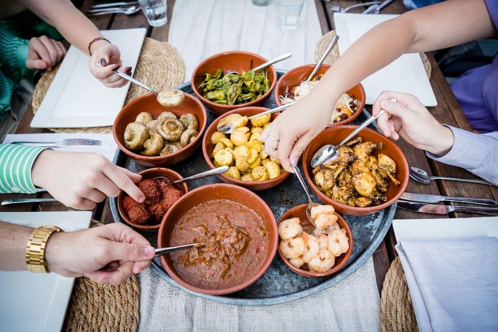 Bij een sharing dinner delen gasten schalen vol gerechten aan tafel. Dit zorgt voor interactie, gezelligheid en een warme, informele sfeer.