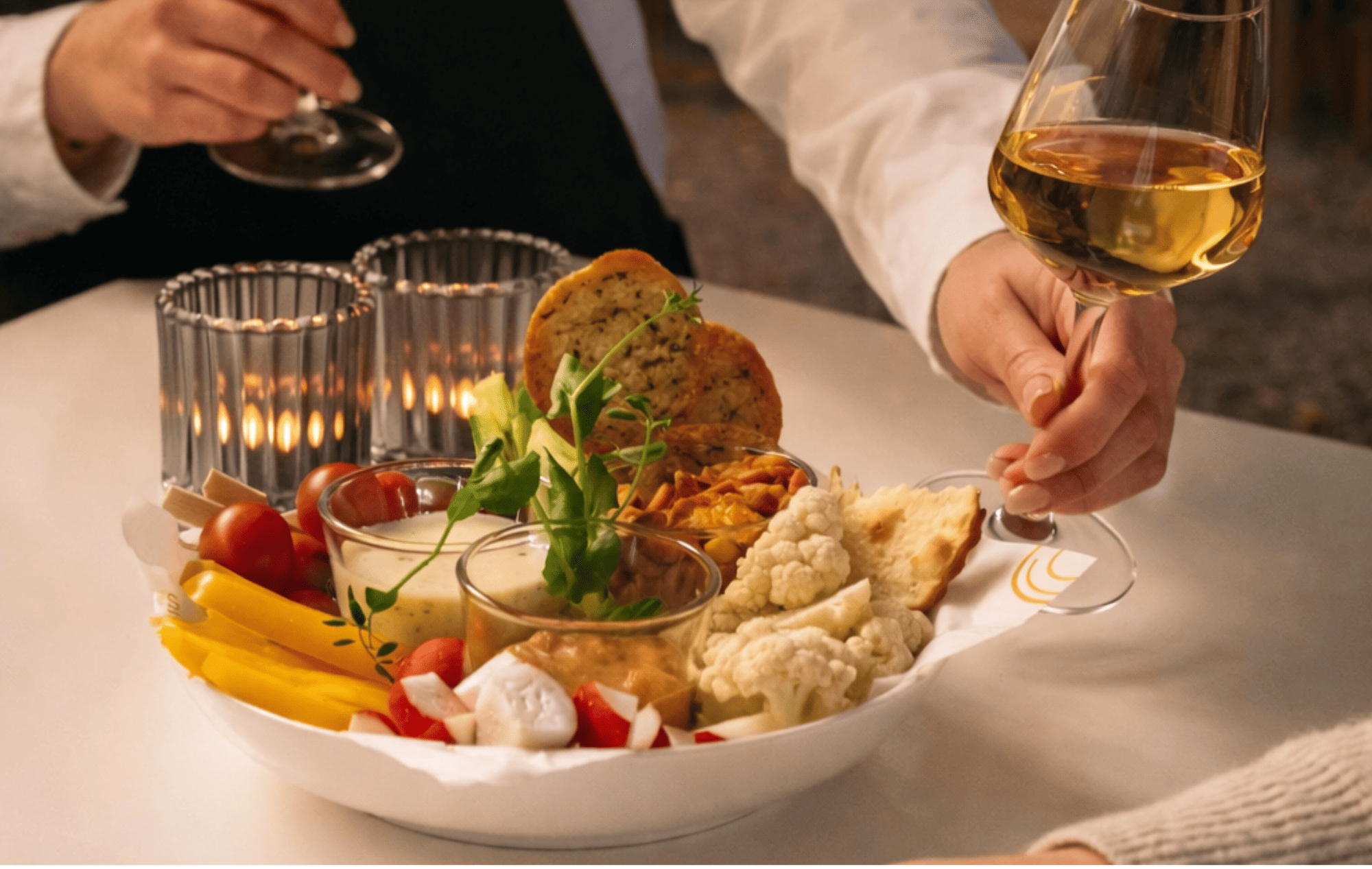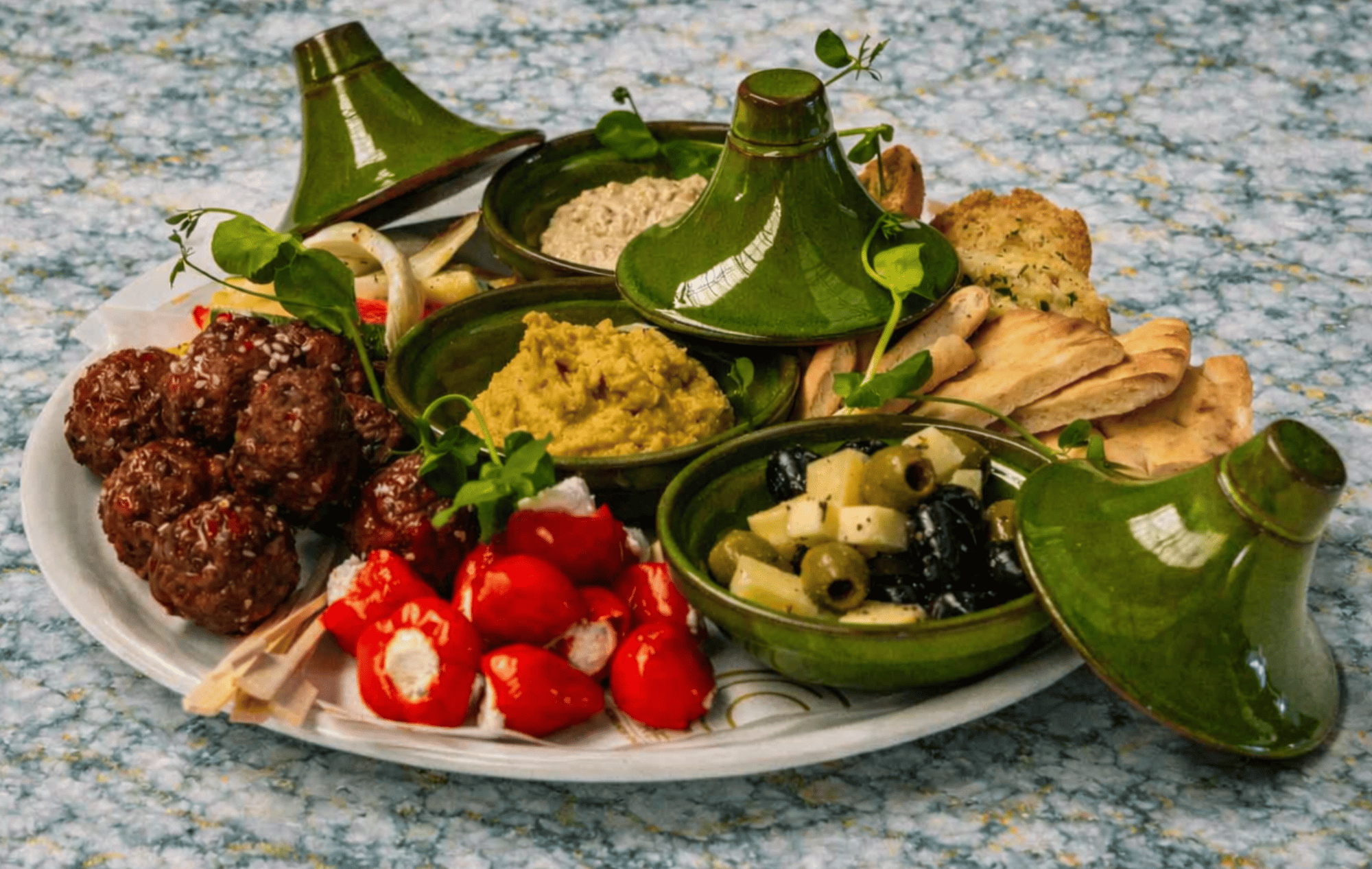 Het tafelgarnituur Mediterra brengt de smaken van de mediterrane keuken samen op tafel. In deze samenstelling vind je diverse kleine gerechten en hapjes die geïnspireerd zijn op culinaire tradities uit landen rondom de Middellandse Zee. Denk aan smaakvolle tapas, vers brood, spreads en kleine gerechtjes met verse kruiden en olijfolie. Door de lichte en frisse smaken ontstaat een gevarieerd tafelconcept dat perfect past bij borrels, informele diners of zakelijke bijeenkomsten. De gerechten worden gepresenteerd in schaaltjes en op planken zodat gasten gemakkelijk kunnen delen. Hierdoor ontstaat een ontspannen sfeer waarbij iedereen verschillende smaken kan ontdekken.